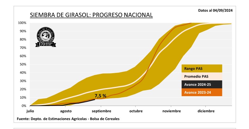 La siembra de girasol marcó un progreso intersemanal de 2,3 puntos porcentuales, cubriendo a la fecha el 7,5 por ciento del área proyectada en 1,85 millones de hectáreas, según indicó la Bolsa de Cereales de Buenos Aires.
