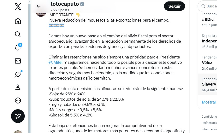 Mediante una publicación en X, el ministro de Economía Luis Caputo anunció una “nueva reducción de impuestos a las exportaciones para el campo”.