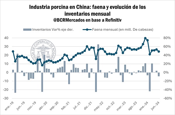 Además, las existencias de vientres han sufrido un recorte importante desde los elevados niveles alcanzados en los años previos. Durante 2023, con más de 717 millones de cabezas, los holgados suministros de carne de cerdo llevaron a mantener precios deprimidos durante todo el ciclo y, según el Ministerio de Agricultura y Asuntos Rurales de China (MARA), los productores porcinos no habrían sufrido pérdidas sostenidas tan importantes desde el año 2014. Esta situación tendió a agravarse con la incidencia de la peste porcina africana, que en conjunción ha llevado a un importante ritmo de liquidación de ganado el año pasado, tendencia que se mantuvo durante el primer semestre de 2024.