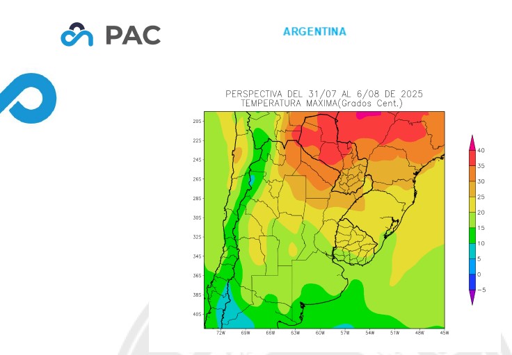 Al inicio de la perspectiva (30 de julio), continuarán soplando los vientos del trópico, que hicieron su entrada en los días previos, provocando temperaturas máximas muy sobre lo normal sobre el norte del área agrícola, mientras el centro experimentará registros dentro del rango medio, y el sur observará valores algo bajo la media.
