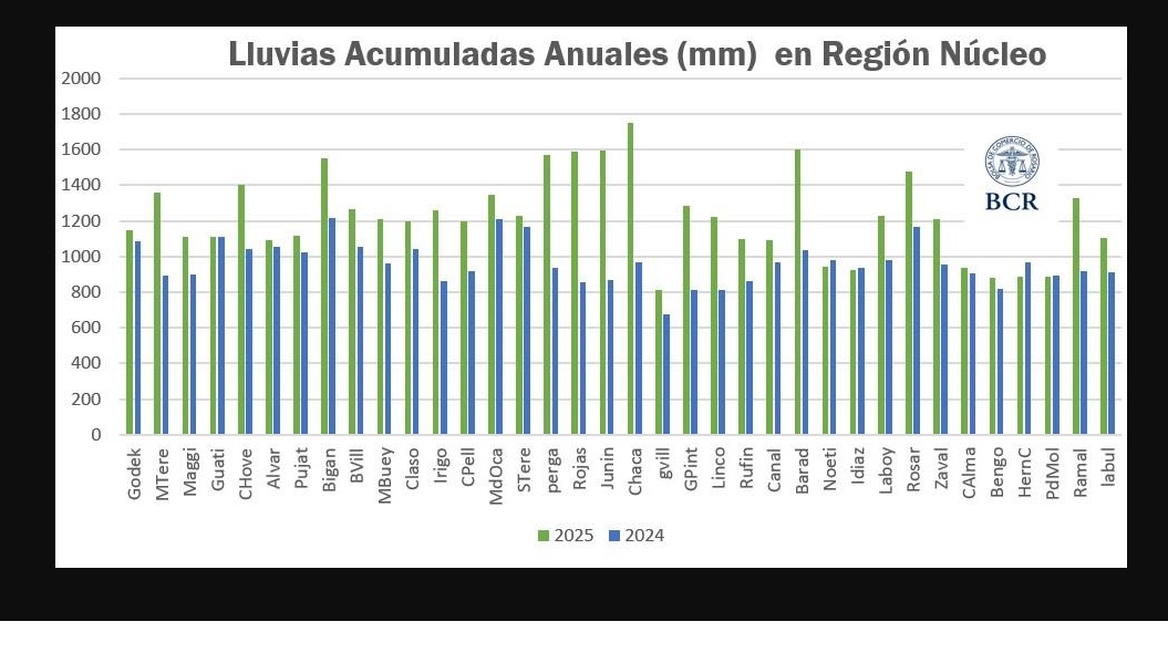 El promedio anual de 1222 mm excedió el límite histórico, aunque el último mes cerró 27% por debajo de lo normal, generando preocupación por las reservas de agua en el suelo en la región núcleo según la Bolsa de Comercio de Rosario.