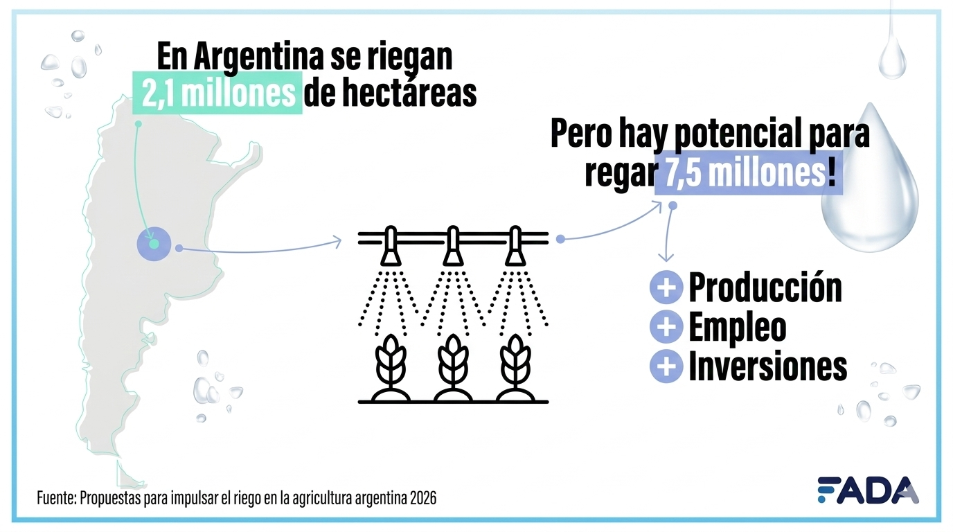 El mundo demanda cada vez más alimentos y producir enfrentando las constantes sequías es un gran desafío. En Argentina se riegan 2,1 millones de hectáreas, pero hay potencial para regar 7 millones y medio. Un estudio de FADA (Fundación Agropecuaria para el Desarrollo de Argentina) encontró un potencial oculto en la ampliación y mejoramiento del riego. En el informe se trabajaron propuestas que revelaron al riego como un generador de más empleo, más producción y un aliado de la sustentabilidad.