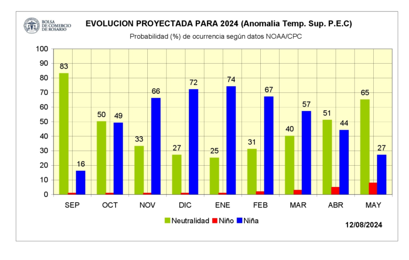 Pero lo que remarca el consultor de la BCR, Alfredo Elorriaga, es que los modelos predictivos ENOS/IRI prevén condiciones neutrales hasta el trimestre agosto/octubre de 2024.