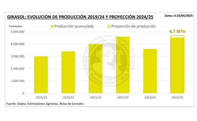 La Bolsa de Cereales de Buenos Aires ajustó el área sembrada de girasol en sectores del centro del área agrícola, específicamente en el Centro-Norte de Santa Fe y el Núcleo Norte, lo que ha resultado en una nueva estimación de siembra de 2,05 millones de hectáreas para el ciclo 2024/25.