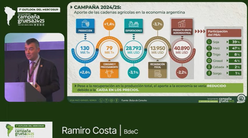 Bajo este contexto, Ramiro Costa, economista jefe de la entidad, destacó que la producción proyectada de 130 millones de toneladas para la campaña 24/25 representa un aumento del 2,6% respecto a la campaña anterior. Sin embargo, debido a la caída de los precios, la contribución del sector a la economía argentina se vería afectada. Las exportaciones disminuirían un 3,1%, alcanzando los 28.793 MUSD. Además, la recaudación fiscal sería de 13.950 MUSD (-3,7%) y el valor agregado se reduciría a 40.890 MUSD (-2,2%).