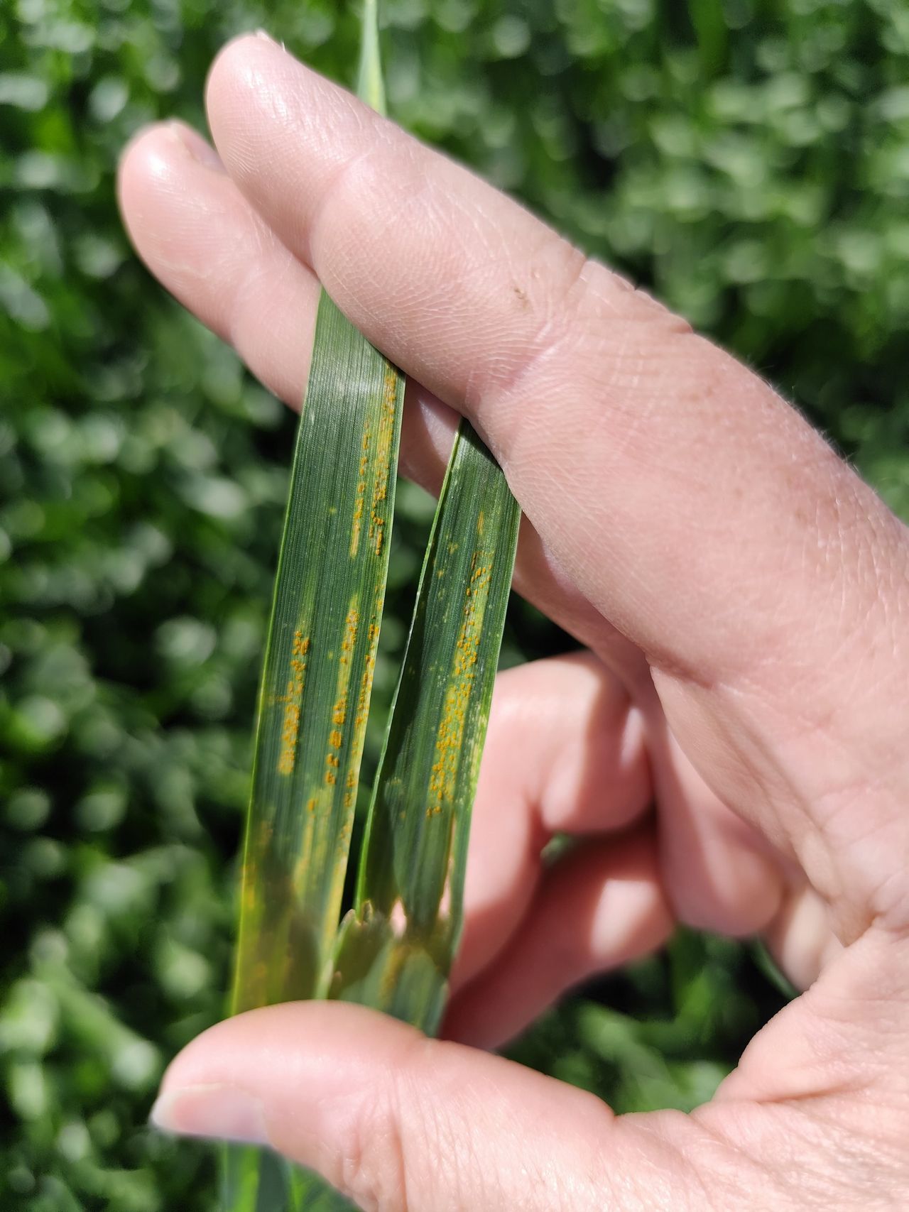Por su parte, la roya amarilla o estriada (Puccinia striiformis), un patógeno muy agresivo, apareció desde el macollaje. Su umbral de aplicación es muy bajo; la mera detección (con apenas un 1% de incidencia) ya obliga a la acción. Este patógeno es altamente policíclico, pudiendo producir hasta 3.000 esporas por pústula por día.