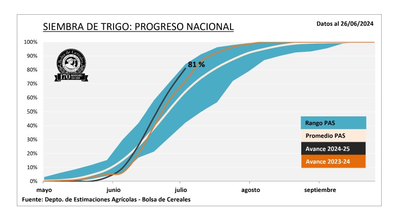 Desde el informe de la semana pasada, la siembra de trigo alcanzó a cubrir el 81 por ciento de los 6,3 millones de hectáreas proyectadas para el ciclo 2024/25, tras un progreso intersemanal de 15,5 puntos porcentuales.