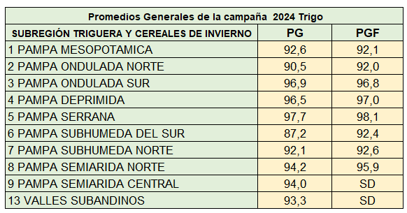 En tanto el promedio general de Poder germinativo con fungicida en trigo fue 95,0 por ciento, sobre un total de 3215 muestras analizadas por 18 laboratorios, y el 90,7 por ciento de las muestras presentó PGF mayores a 90.