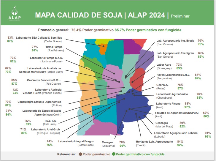 La Asociación de Laboratorios Agropecuarios Privados (ALAP) realizó un documento en el que se muestran las zonas productoras de soja del país. En un análisis preliminar, el poder germinativo de las muestras de soja analizadas desde el 1° de marzo al 10 de septiembre de 2024 en los laboratorios de la red es de 76,4% versus 85,1% observado en 2023.