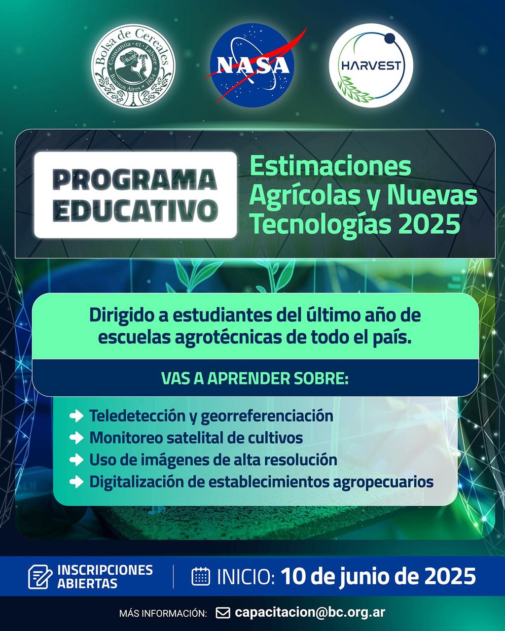 La Bolsa de Cereales, junto a sus socios estratégicos de NASA Harvest, lanza en 2025 una nueva edición de esta iniciativa que capacita a estudiantes y docentes, del último año del secundario, de establecimientos educativos agropecuarios y agroindustriales, en el uso de herramientas de teledetección y de aplicaciones para georreferenciación, seguimiento de cultivos, digitalización de establecimientos agropecuarios y utilización de imágenes de alta resolución.