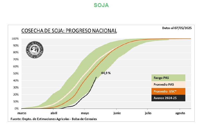 Luego de un importante progreso intersemanal de 21 puntos porcentuales, se ha recolectado el 44,9 por ciento de la superficie apta de soja a nivel nacional, con una demora interanual de tan solo 2,8 puntos porcentuales, según la Bolsa de Cereales de Buenos Aires.