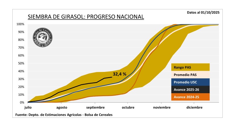 Por su parte, de la nueva superficie proyectada para girasol en 2,7 MHa (100 mil hectáreas más que en la proyección anterior), ya se encuentra implantado el 32,4 por ciento luego de un progreso intersemanal de 1,4 p.p., manteniendo adelantos en comparación al promedio U5C y al ciclo previo de 12,3 y 22,1 p.p., respectivamente.