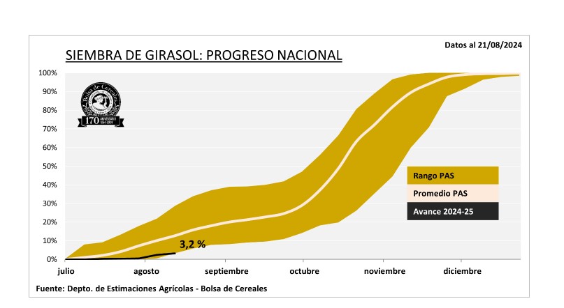 Luego de las lluvias de los últimos días, se dio inicio a la campaña 2024/25 de girasol, con varias semanas de retraso reflejadas en una demora respecto al promedio histórico PAS de 9,5 puntos porcentuales, según indicó la Bolsa de Cereales de Buenos Aires.