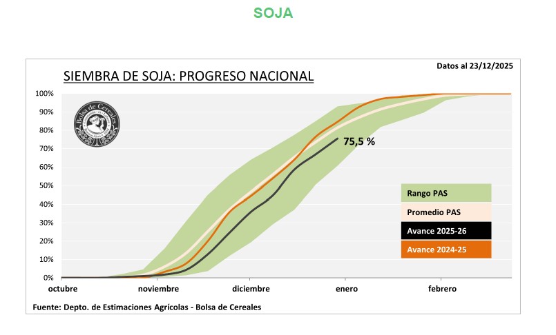 Luego de un progreso intersemanal de 8 p.p., la siembra de soja, a nivel nacional, cubre el 75,5 por ciento de los 17,6 millones de hectáreas proyectadas para la presente campaña, según la Bolsa de Cereales de Buenos Aires.