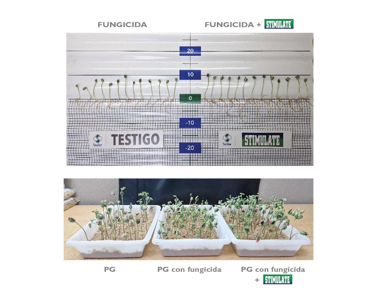 El tratamiento impacta entonces de manera directa sobre la energía germinativa de las semillas viables, favoreciendo una germinación más rápida, homogénea y vigorosa. La dosis recomendada de Stimulate es de 250 cc por cada 100 kg de semilla, acompañado de un análisis previo del poder germinativo y vigor de la semilla, para realizar ajustes en la densidad de siembra según sea necesario.
